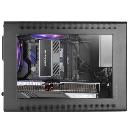 El panel lateral de cristal templado proporciona una visión completa del interior del setup, destacando los componentes y efectos de iluminación. Un diseño que combina estética gaming y funcionalidad, transformando tu PC en el protagonista absoluto de cualquier espacio.