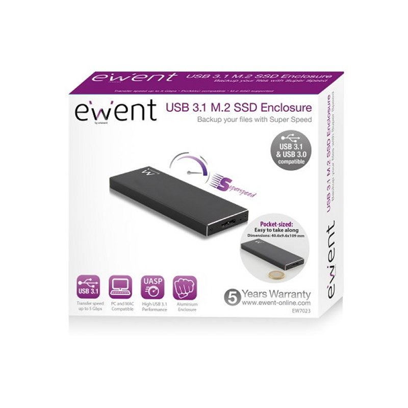 Proteja su SSD M.2 con el EW7023 el carcasa de aluminio sólido USB 3.1 Portátil Gen1 (USB 3.0) M.2 SSD. El EW7023 es ligero y con tamaño de bolsillo fácil de llevar. El recinto admite conectores SSD M.2 con B y BM. El SuperSpeed USB 3.1 y UASP aseguran una transferencia rápida de archivos.