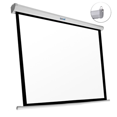 | Características | – área visible de 200 x 200 cm. – Bordes negros de 3 cm – Carcasa blanca y a prueba de polvo – Apto para pared y techo – Parte trasera en negro para mayor refracción de la luz – Muy buena planeidad y tensión gracias al grosor de la tela – Voltaje 230 VAC- Frecuencia 50Hz – Salida del cable de alimentación por el lado izquierdo visto desde frente de la pantalla – Incluye interruptor de pared y mando a distancia infrarrojo – Factor de ganancia de 1.2, ideal para cine en casa y presentaciones – La caída de la pantalla puede ser frenada en cualquier punto, por lo que se puede ajustar la longitud de la pantalla a cualquier formato. – La barra inferior queda al ras con la carcasa |