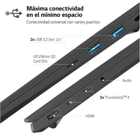 LG gram ofrece no solo varios puertos sino también dos Thunderbolt 4 para la máxima escalabilidad. Experimenta la pantalla 5K con 40GB de velocidad de transferencia mientras cargas dispositivos externos simultáneamente.