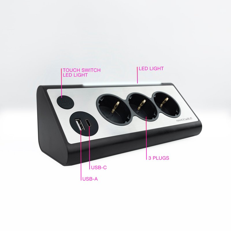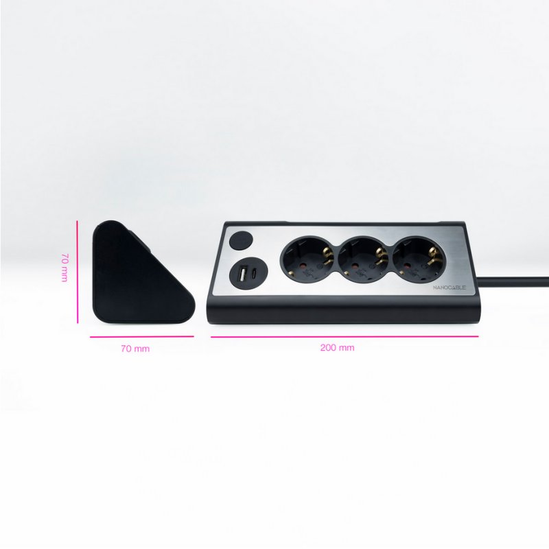 | Características | – 3 tomas de corriente con toma de tierra – 2 puertos USB de carga (USB-C y USB-A) – USB-A: 5V/3A, 15W. 9V/2A, 18W. 12V/1.5A, 18W. – USB-C: 5V/3A, 15W. 15V/2A, 18W. 12V/1.5A, 18W. – USB-A + USB-C: 5V/3A, 15W. – Iluminación led con interruptor – Cable de 1.5 m – Protección infantil – Voltaje: 230V-50Hz – Certificado CE, ROSH, GS y REACH – Color: Negro – Medidas del producto: 200 x 70 x 70 mm Contenido – 1 x Regleta |