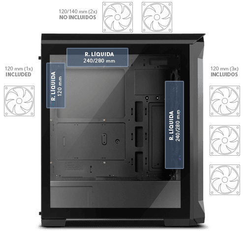 Un chasis diseñado para instalar diferentes opciones en lo que a refrigeración y ventilación se refiere. Permite instalar hasta 6 ventiladores ARGB: tres de en el panel frontal que están incluidos junto con el trasero de 120 mm y posibilidad de instalar dos más en el panel superior de 120 o 140 mm. Asimismo, se pueden instalar sistemas de refrigeración líquida con radiadores de 240/280 tanto en el panel frontal como en el superior y trasera de 120 mm.