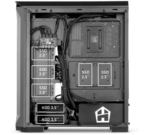 Hummer Quantum te ofrece amplias posibilidades para una configuración de alto rendimiento. Es compatible con placas base ATX, Micro ATX e ITX y dispone de espacio suficiente para ensamblar dos HDD de 3,5” y siete SSD de 2,5”.