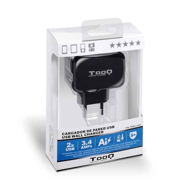 TooQ TQWC-1S02 Cargador de pared 2 USB Negro